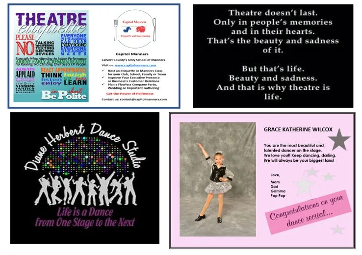 Capitol Manners sponsored an ad in the 2017 program for Diane Herbert’s School of Dance Studio recital and it got me thinking of theater manners. As a mom of one of the dancers, I spent most of my time backstage during the performances. But, I have spent my share of my time as a theater goer. In fact, my husband and I LOVE live theater. We have made a point of bringing our young daughter to live theater. From seeing “Wicked” on the London stage, “Aladdin” on Broadway to “The Nutcracker” by the Ballet Theater of Maryland each year and recently seeing the production of “Little Women” put on by our home town “Twin Beach Players,” we have treasured seeing countless live performances as a family and enjoyed it stress free by knowing what is expected, preparing and behaving accordingly.